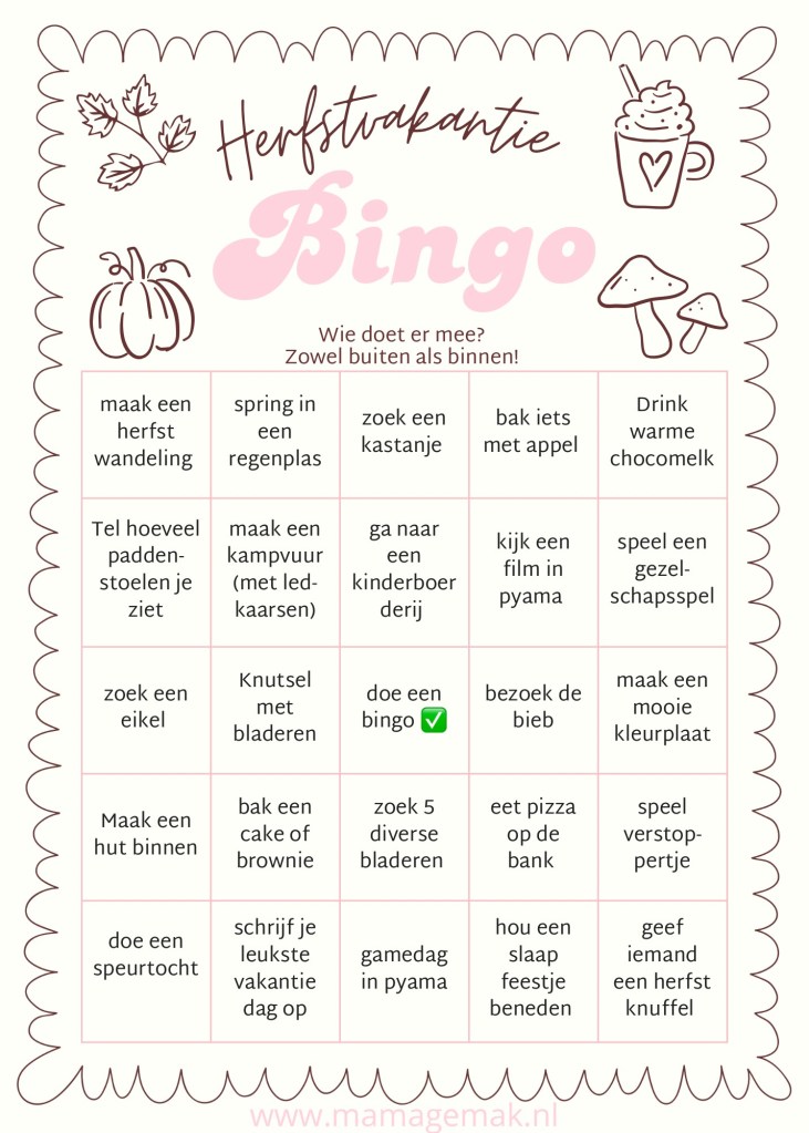 ⬆️Print de bingo, hang hem op de koelkast en vink samen af wat jullie gedaan hebben! Als ze een rij vol hebben kan je een kleine beloning geven, bijvoorbeeld een half uurtje langer opblijven 😉