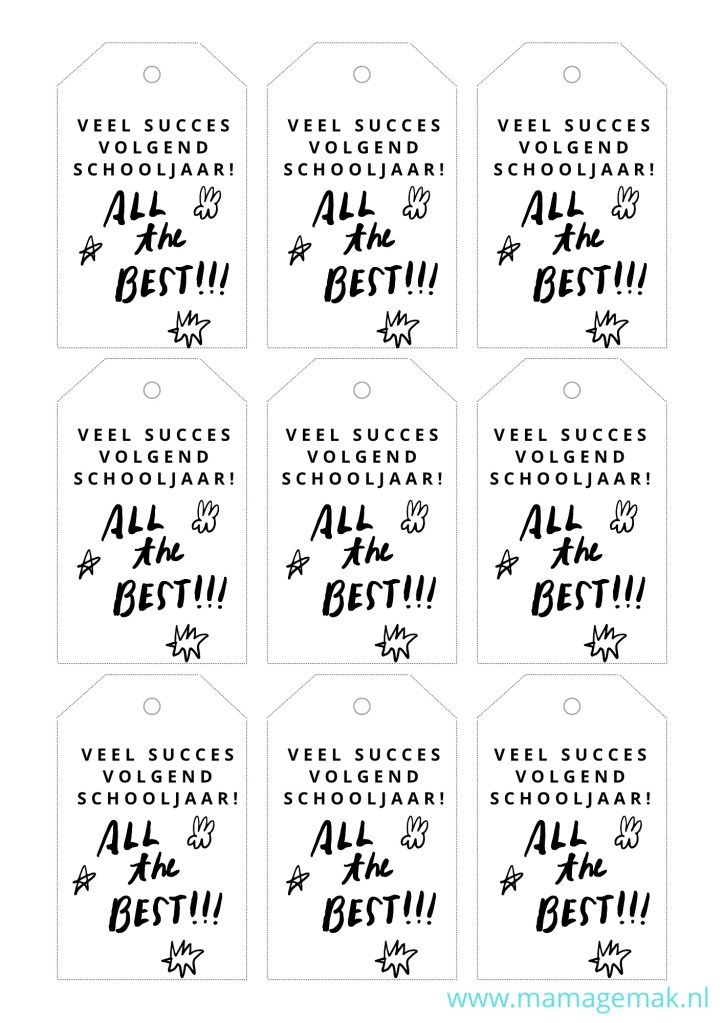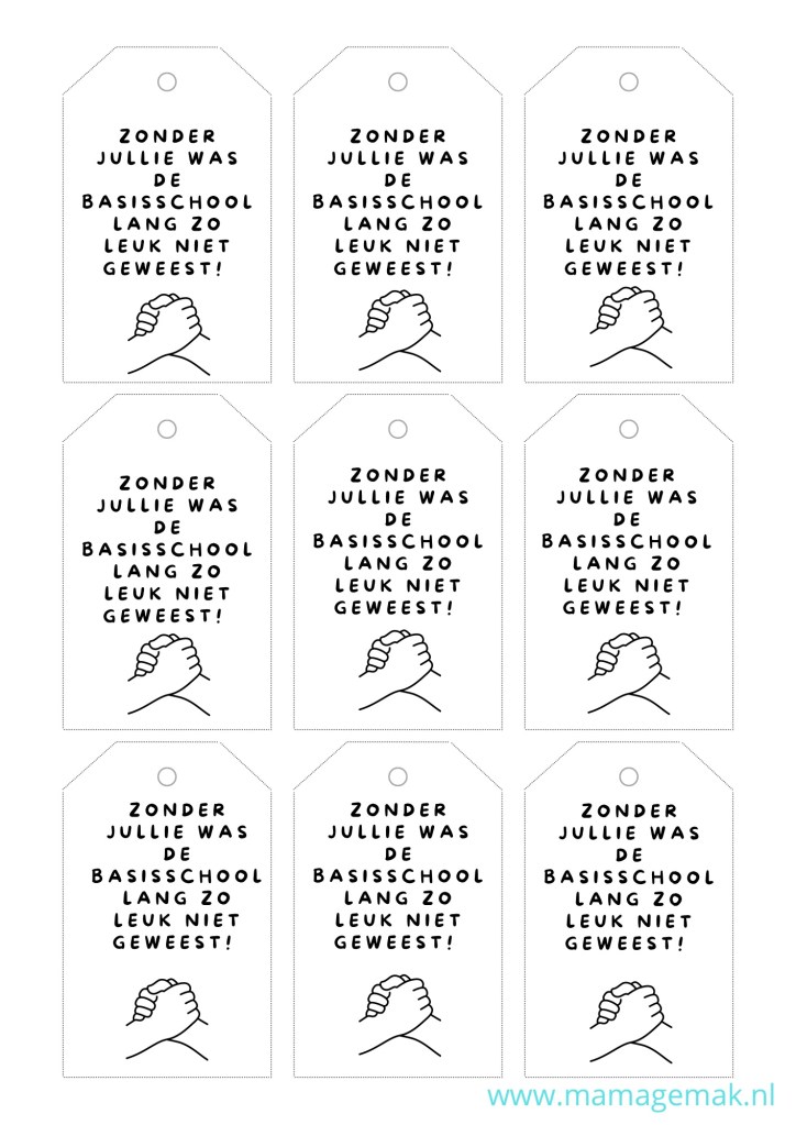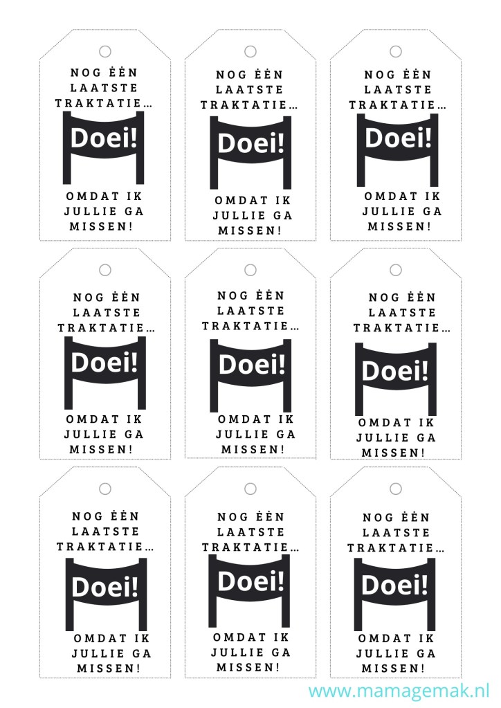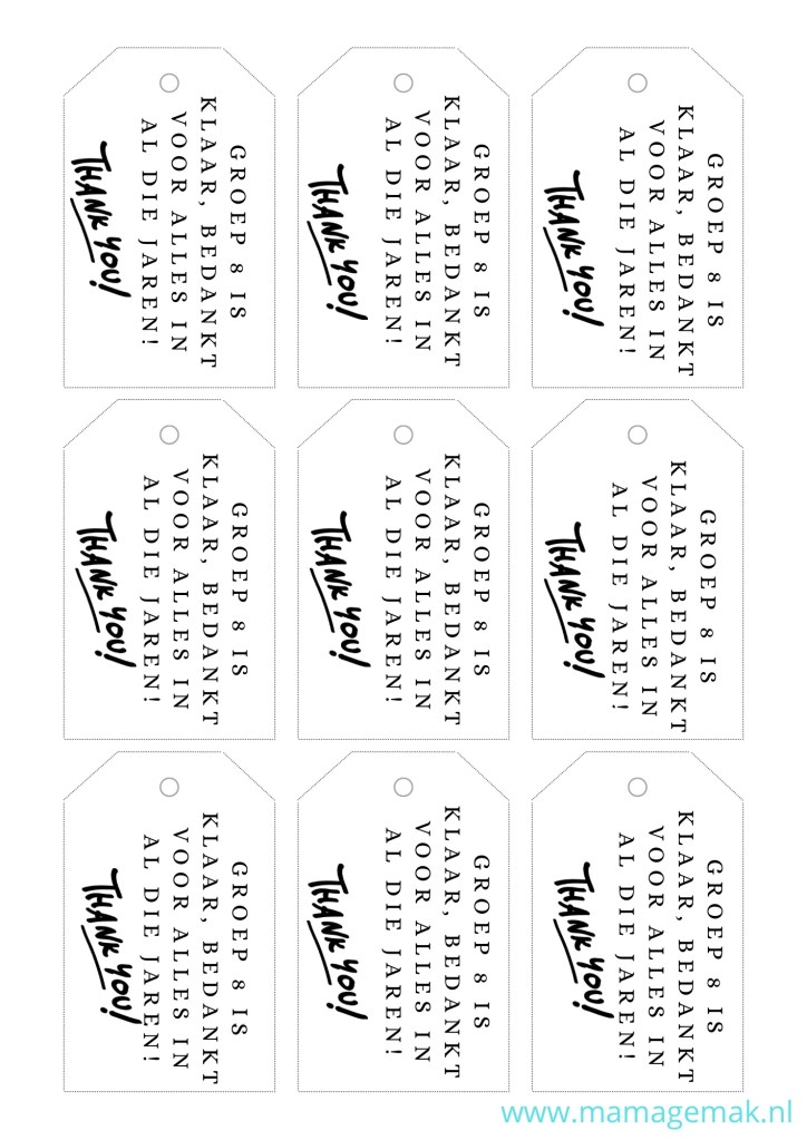 Aan het eind van groep 8 nemen kinderen afscheid van de school, de juffen en meesters, maar ook van hun klas. Het is gebruikelijk dat kinderen bij hun afscheid een traktatie uitdelen. Dat hoeft niet groots of duur te zijn, het gaat om het gebaar. Onderstaande labels zou je kunnen gebruiken aan je traktatie: