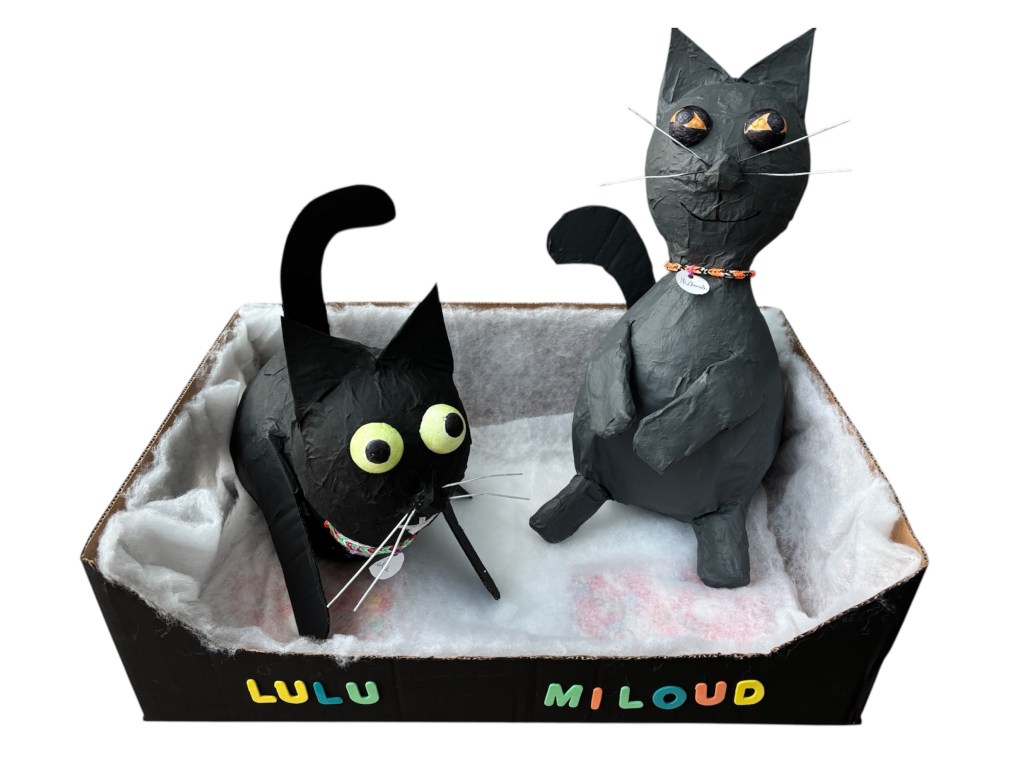 Katten gemaakt met ballonnen en papier-maché voor het lijf en hoofd, karton voor de poten, oren en staart, piepschuin ballen voor de ogen, ijzerdraad voor de snorharen en een bananendoos bekleed met een sneeuwdeken als mand. De halsbandjes zijn geloomd.