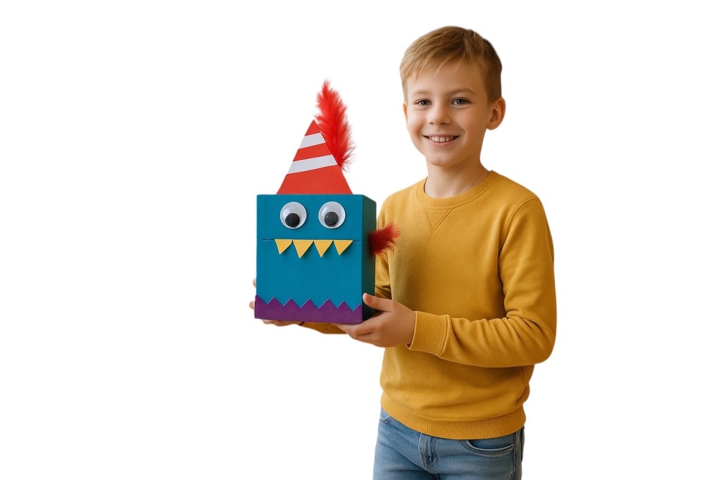 Met karton kan je ook hele leuke surprises knutselen. Het voordeel om met karton te werken i.p.v. papier-maché is dat je wat sneller door kan gaan. Je kan je surprise verven of beplakken met papier of crêpepapier.