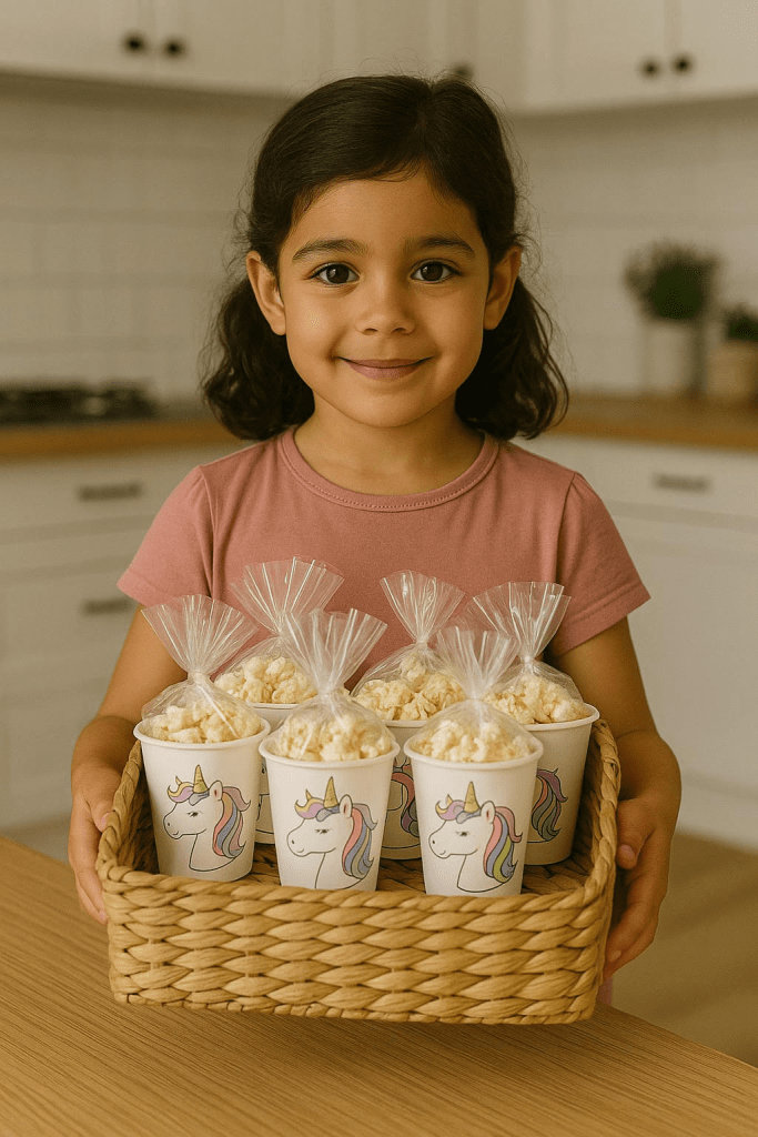 - Verdeel de popcorn in zakjes of de bekertjes